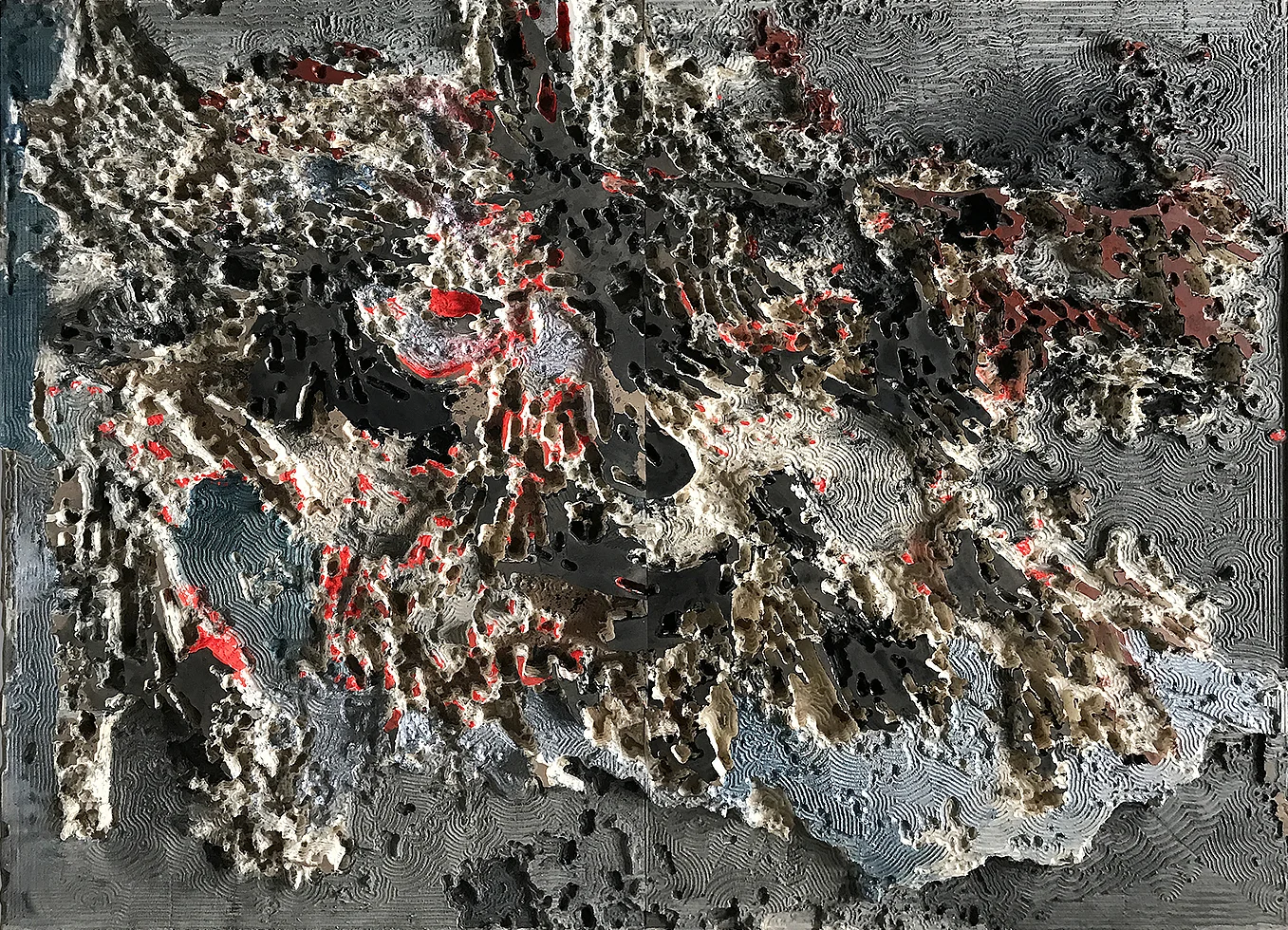 Built by Solid, Territories of Complexity by Guillaume Paturel digital fabricated landscape wood sculpture and acrylic, 1.65 x 2.03 meters